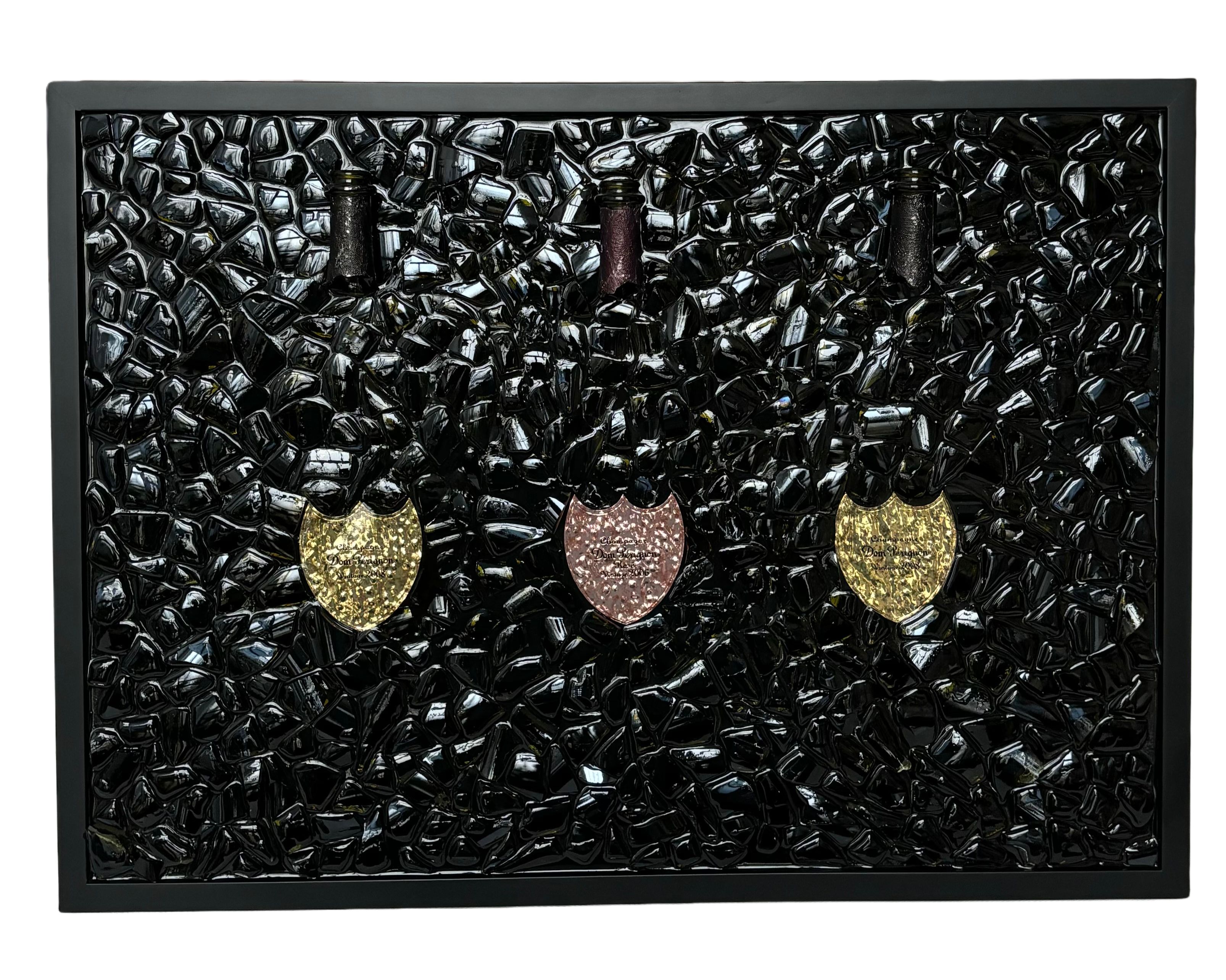 Découvrez l’alliance parfaite entre art et luxe avec ce cadre unique fait main en Bourgogne, mettant en valeur quatre bouteilles de Dom Pérignon Brut Luminous agencées en forme de rosace, inspirée des vitraux des églises. Cette composition innovante et raffinée évoque à la fois l’élégance intemporelle et la modernité du design.